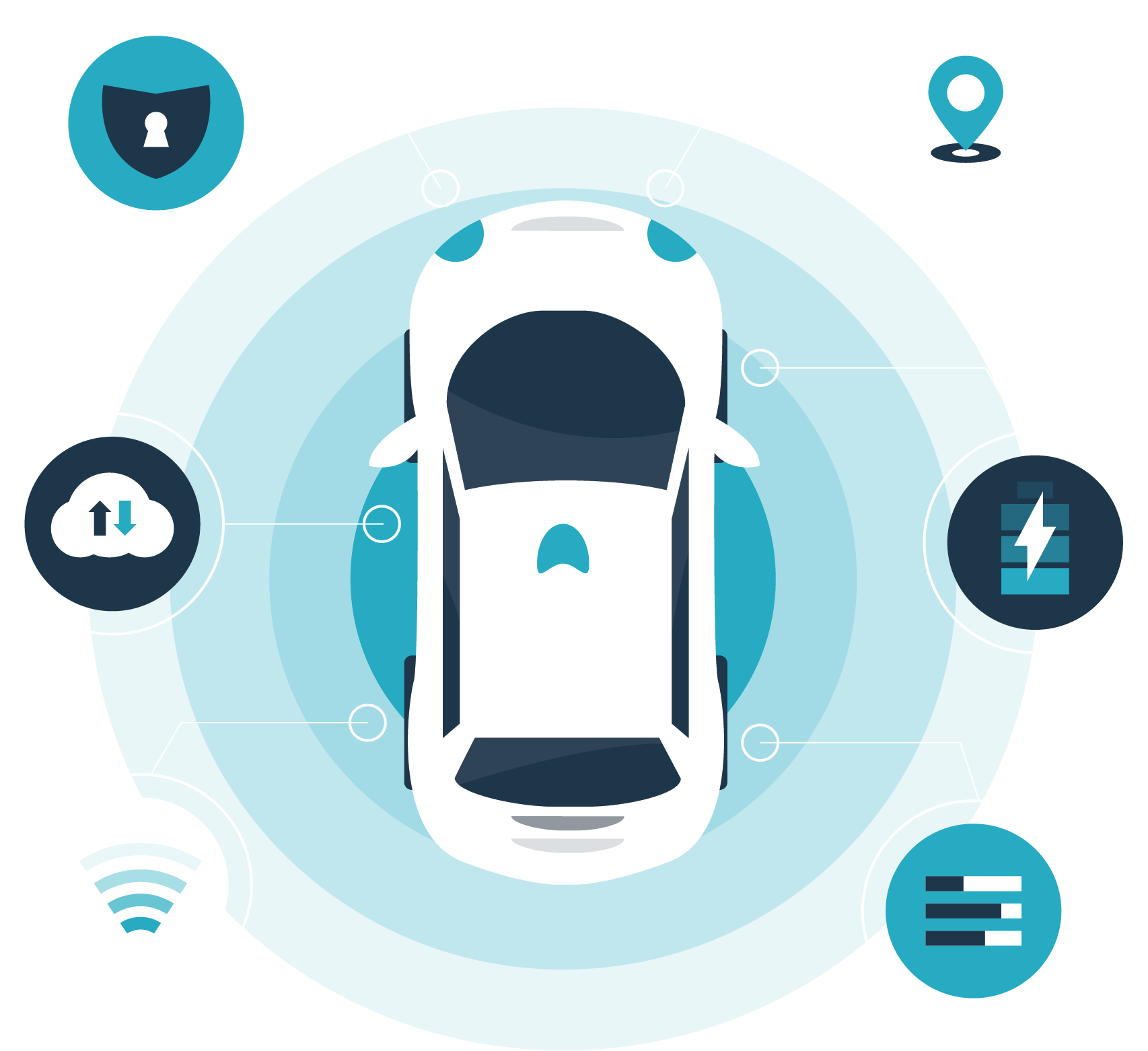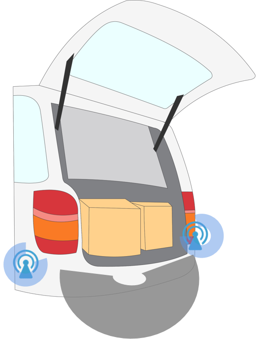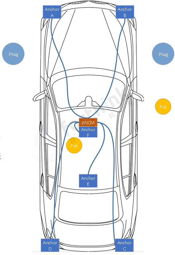 汽車端共部署6個Anchor(UWB定位錨點),協(xié)同BNCM(車載位置解算模塊),精準定位KeyFob(手機或實體車鑰匙)相對于車輛的位置,實現(xiàn)解閉鎖、迎賓等應用。