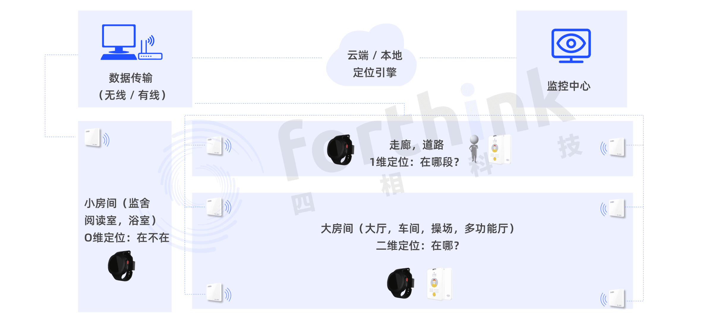 四相采用厘米級(jí)超高精度UWB、藍(lán)牙多模融合定位技術(shù),結(jié)合傳統(tǒng)FRID技術(shù)、視頻監(jiān)控技術(shù),為監(jiān)獄的信息化改造提供智能化一體解決方案。通過(guò)在監(jiān)獄部署定位基站,并為犯人和獄警佩戴定位標(biāo)簽卡的形式,來(lái)獲取精準(zhǔn)位置信息。通過(guò)案例積累,自主研發(fā)智能化、信息化的物聯(lián)網(wǎng)安全平臺(tái),助力監(jiān)獄加強(qiáng)安全監(jiān)管力度,全方位提升安全監(jiān)管效率,降低管理風(fēng)險(xiǎn)。